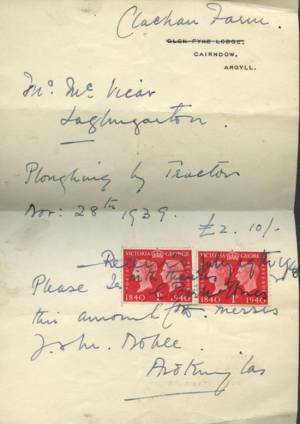 Receipt from Ardkinglas Estate for ploughing at Clachan by Mr McVicar, Laglingarton 1939.